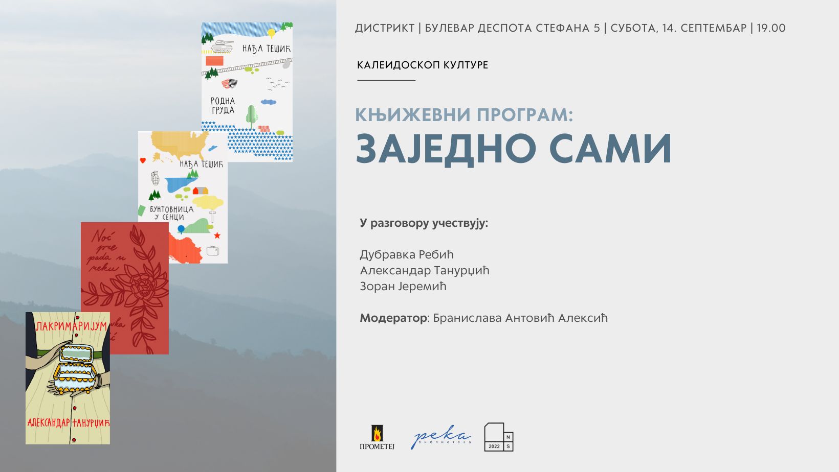 Кроз књижевни програм Заједно сами истражићемо тему идентитетске припадности у књижевним делима едиције Река Издавачке куће Прометеј. Овај догађај одржаће се 13. и 14. септембра у Дистрикту (булевар Деспота Стефана 5, Нови Сад), а у програму учествују аутори Дубравка Ребић, Александар Танурџић и Зоран Јеремић, док ће модератор разговора бити новинарка Бранислава Антовић Алексић.